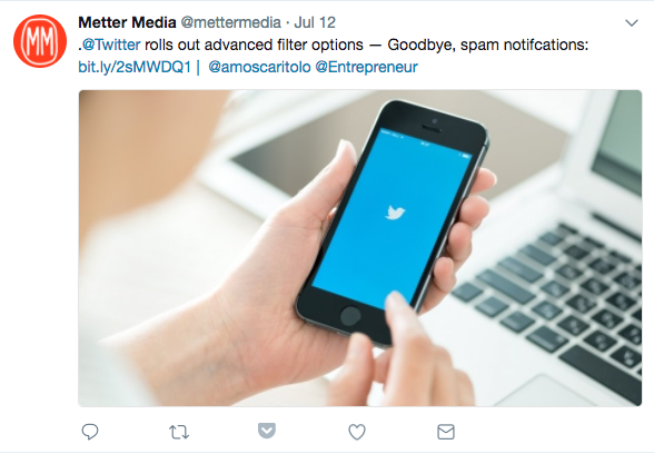 Screen Shot 2017-08-26 at 12.21.39 AM Previous Next Published October 21, 2017 at 588 × 408 in Social Media Management: Metter Media Twitter post for industry news